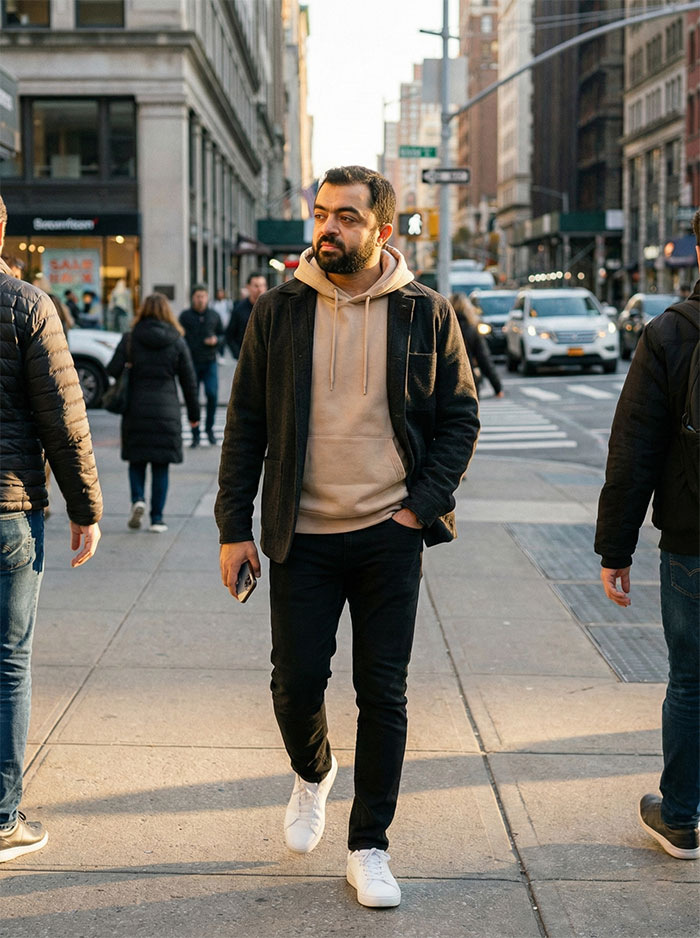“A hyper-realistic, candid street photography shot of the [uploaded image man] walking mid-stride along a bustling city sidewalk during the golden hour. He is wearing a layered street-style outfit consisting of a slightly oversized beige hoodie under a dark jacket, slim black jeans, and crisp white sneakers. His posture is relaxed, one hand in his pocket and the other loosely holding a smartphone, with his head turned slightly to the left as if distracted. The lighting is warm and soft, creating natural shadows and illuminating realistic skin texture. The background features motion-blurred pedestrians and city architecture with a shallowdepth of field (f/1.8). The image has a documentary feel with subtle 35mm film grain. –ar 3:4“